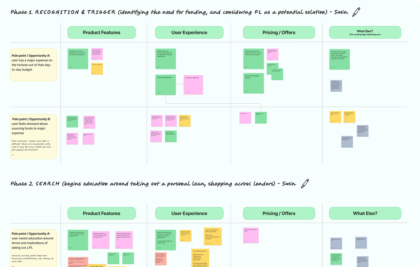 After conducting both the competitive analysis as well as customer interviews, I summarized both sets of insights into a customer journey of a Personal Loan borrower to be used as artifacts for the broader team to understand at-a-glance who we're building the product for and as a springboard for our brainstorm.