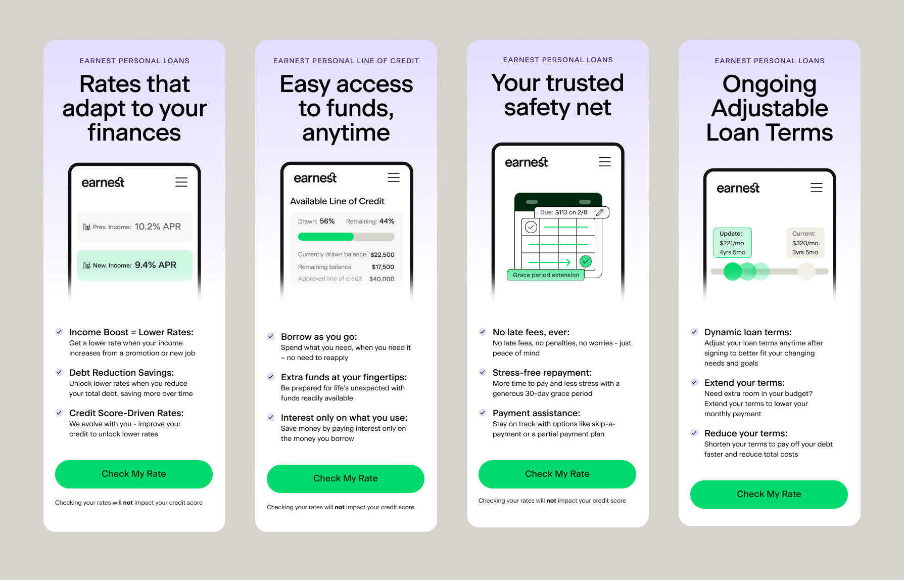 As part of the MVP launch, we also focused on targeting existing Earnest customers. I thought there could be a way to leverage the existin credit data we have for the users and show them how much they could save with a Personal Loan compared to putting their spending on credit cards with high APRs. I explored options showing the maximum $ savings, as well as interest rate difference.